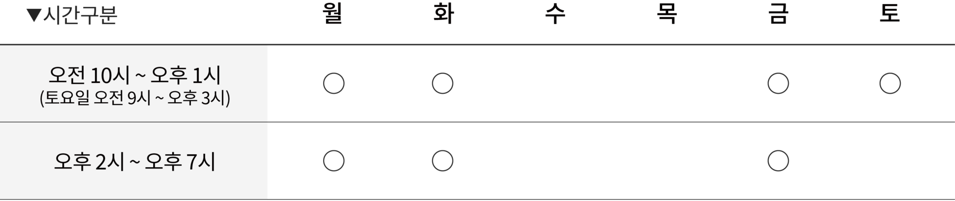 - 평일 진료 : 오전 10시 ~ 오후 7시 / 오후 1시 ~ 오후 2시 (점심시간)- 토요일 진료 : 오전 9시 ~ 오후 3시 / 오후 1시 ~ 오후 1시 30분 (점심시간)